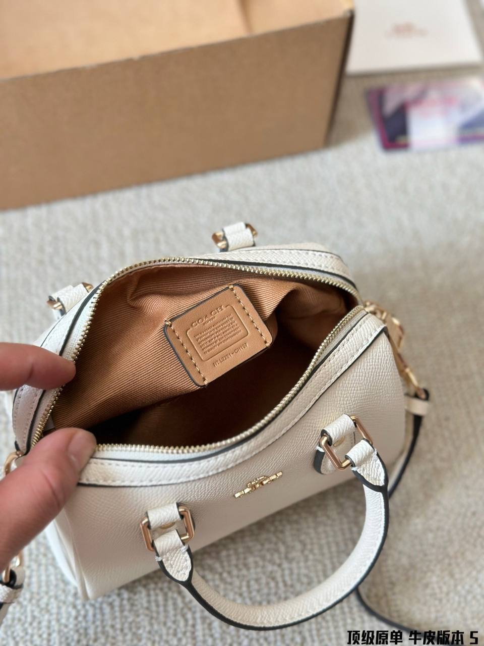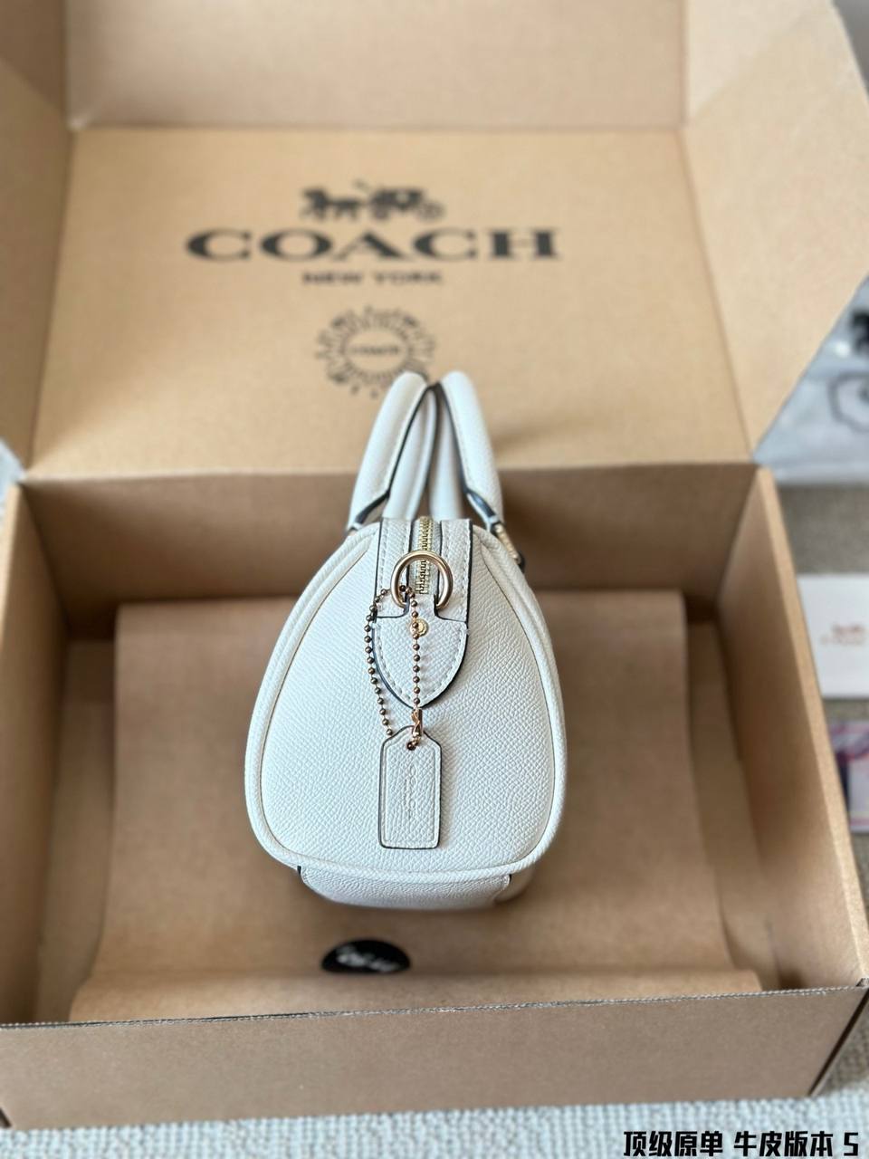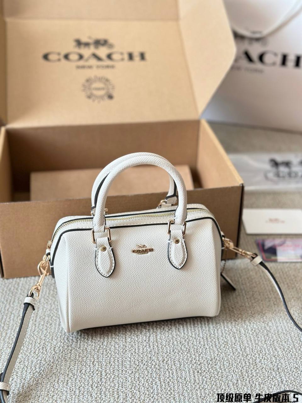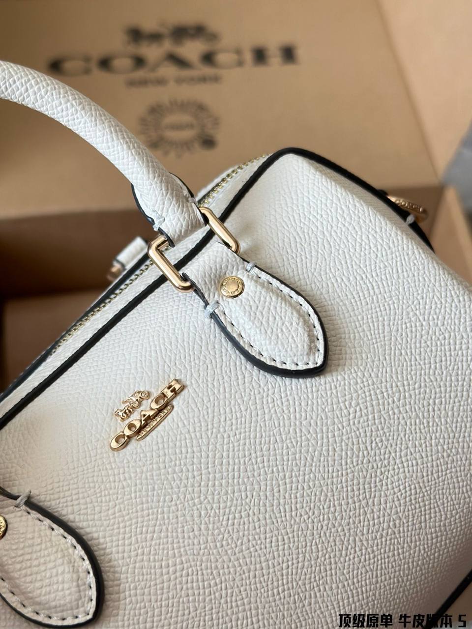 The exterior of the bag features the iconic Coach logo subtly embossed or engraved, signifying its pedigree and craftsmanship. The design is sleek and minimalist, with clean lines and understated details that exude sophistication.